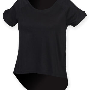 Give boring t-shirts the cold shoulder. This relaxed fit t-shirt is a cool alternative for the fashion-conscious, with short raglan sleeves, cut-out shoulders and curved drop tail hem. Tear-out label for easy rebranding.