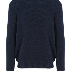 Regenerated cotton blended with recycled polyester sweater. Seed stitch knit with rib neck, cuffs and hem.