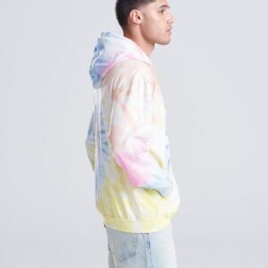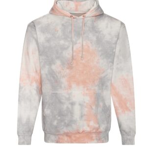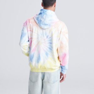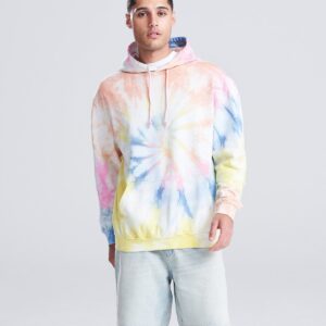 Relaxed fit. Twin-needle stitching detail. Double fabric hood with round drawcords. Kangaroo pouch pocket. Brushed inner fleece. Ribbed cuffs and hem. Tie-dye design. Every piece is unique. Size pip.