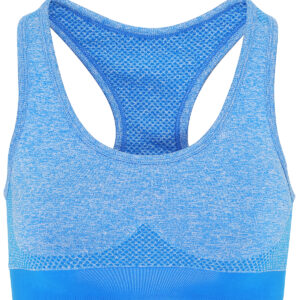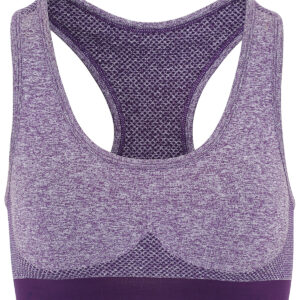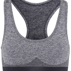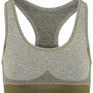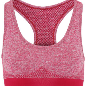 Seamless sports bra. Contrast grown on waistband. Wicking fabric. Body sculpting design detailing. Medium impact. We recommend using block out vinyl and inks.Product contains no branded neck or waist label. Removable Kimble or looped garment tags. Inner seam label holds important product information on one label with a second label containing brand information which can be cut-away.
