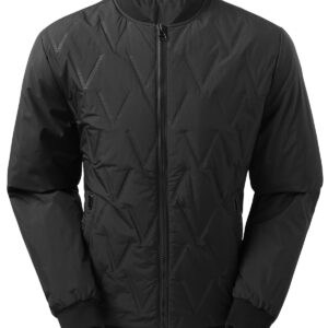 Tonal fashion coil zip on centre front with signature zip puller. Front & Back panels to be insulated with moulded vector shaped pattern. Insulated plain sleeves. 100gsm lightweight polyester fill. Fully-lined in tonal polyester. Bomber style collar. Welt pockets with rubberised stud opening, striped grosgrain trim with rectangular eyelet. Tonal elasticated cuffs and hem. Internal double jet zipped pocket. Internal zipped opening for embroidery access. Product contains no branded neck label.* Removable Kimble or looped garment tags. Inner seam label holds important product information on one label with a second label containing brand information which can be cut-away.
