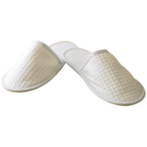 Closed toe mule slippers. Textured waffle woven fabric. Matches TC086 Waffle Robe. Mixed fibre sole.