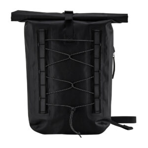 Waterproof fabric. Webbing attachment loops with reflective accents. Waterproof main compartment. Front bungee attachment. Zipped side pocket. Roll-top closure. Padded, adjustable shoulder straps. TearAway label for ease of rebranding.
