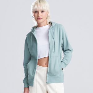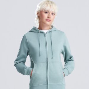 Full-zip zoodie. Women’s relaxed fit. Covered main plastic YKK zip. Twin-needle stitching detail. Double-fabric hood. Self-coloured drawcords. Kangaroo pouch pockets. Simple tear-out label makes it perfect for rebranding. Brushed inner fleece. Ribbed cuffs and hem. Soft cotton-faced fabric creates the ideal printing surface.