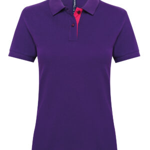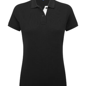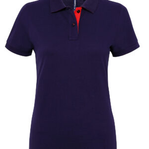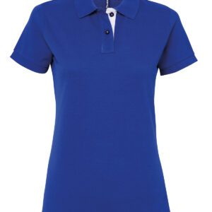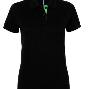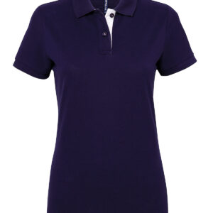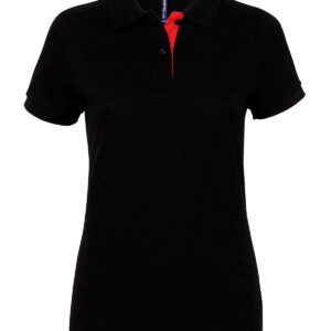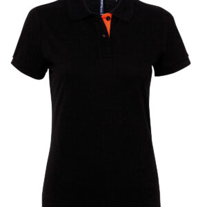 Fitted polo for women with contrast collar and placket. Two contrast coloured buttons on placket. Contrast colour on side vents. Twin needle stitching on hem. Ribbed knit collar and sleeve cuffs. Product contains no branded neck label. Removable Kimble or looped garment tags. Inner seam label holds important product information on one label with a second label containing brand information which can be cut-away. Please note old stock may contain a fixed branded label.