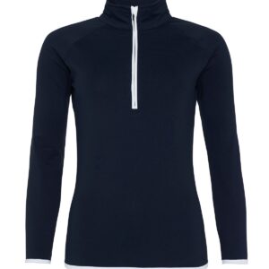 AWDis' own CoolFit blended fabric containing elastane that provides stretch for comfort and a great fit, girlie fit, reflective tab at back of neck helps keep ear phone cords in place, self-fabric contrast colour binding at zip, cuffs and hem, raglan sleeve design creates ease of movement, 1/2 zip with stand-up collar for warmth, chin guard prevents irritation, simple tear off label makes it perfect for rebranding, UPF 30+ UV protection.