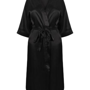 Ladies satin robe. Kimono styling with 3/4 sleeves. Below the knee length. Side pockets. Self-fabric tie belt.