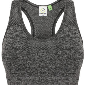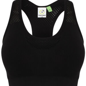 Seamless bra with removable padded cups and racerback. Self- fabric mesh inserts on front straps, V insert on front and on racerback panel. Self-fabric binding around neck, armholes and back. Tombo tear-out label. WRAP certified. BSCI certified.