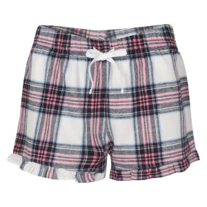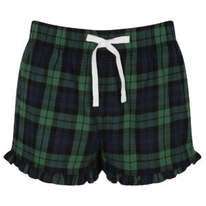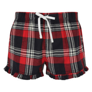 Woven tartan shorts with frill hem. Full elasticated waist with contrast mock drawcord. Tear-out label. BSCI certified. Vegan certified.