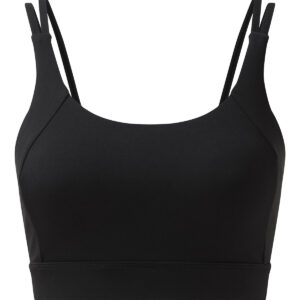 Medium-impact sports bra. Elasticated under bust for added support. Panel detailing to front and back of bra. Removable padding inner. Double strap detailing to both sides of bra. Twist-back detailing that sits above a hook and eye fastening. We recommend using block out vinyl and inks.Product contains no branded neck or waist label. Removable Kimble or looped garment tags. Inner seam label holds important product information on one label with a second label containing brand information which can be cut-away.