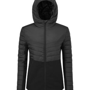 Stretchy shell panels on the sides and sleeves make this women?s TriDri? insulated hybrid jacket the perfect style for outdoor workouts. Lightweight, with quilted detailing, hybrids are designed to keep you warm by regulating body temperature. With internal storm flap and elasticated hood and sleeves, this jacket will protect you whilst training in the elements.