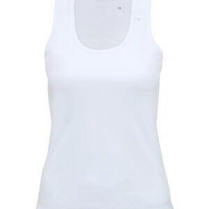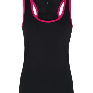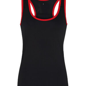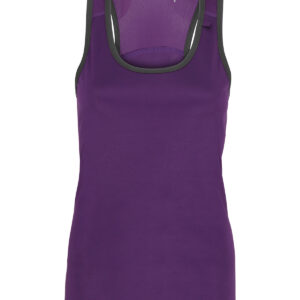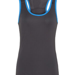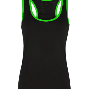 Wicking fabric. Stretch. Scoop neck. Racerback. Hip length hem. Mesh panel on the upper back. Lightweight. Contrast trim details around the straps, arm holes and across the back. Loop detailing for headphones. We recommend using block out vinyl and inks.Product contains no branded neck or waist label. Removable Kimble or looped garment tags. Inner seam label holds important product information on one label with a second label containing brand information which can be cut-away.